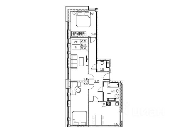 кухня, раздельный сан-узел, большая лоджия, квартира коридорного типа, все комнаты выходят в длинный, прямой коридор.