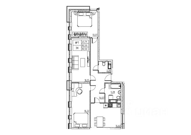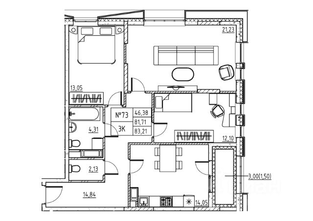 Комната 8 м2. Кухня 7.7 м2. Коридор 12.3 м2. Туалет 1.2 м2. Ванная 2.25 м2.= 85.85 м2 вся
