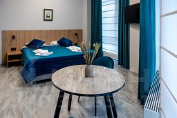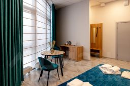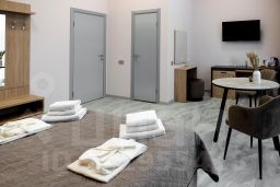 Спальная зона представлена удобной двуспальной кроватью с ортопедическим матрасом, которую при необходимости можно трансформировать в две односпальные кровати, прикроватными тумбочками, туалетным столиком с зеркалом. Оснащен всем необходимым для комфортного пребывания гостей: рабочий стол, чайная станция, холодильник, телевизор, шкаф для одежды, полка для багажа, телефон для внутренней связи, Wi-Fi, санузел оснащен душевой кабиной, феном, предоставляется мыло, гель для душа (в диспенсерах), сейф, халат, тапочки, зубной набор, шампунь, кондиционер для волос.