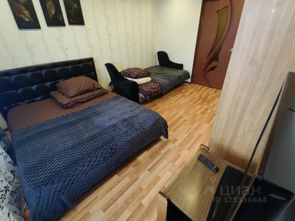 Сдаётся квартира с двумя просторными раздельными комнатами. Чек, куаркод. Большая двуспальная кровать, два раскладных дивана, кресло-кровать, раскладная кровать. Есть электрический чайник, фен, телевизор, посуда, по запросу постельное бельё и полотенца бесплатно. Застекленная просторная лоджия. Гигиенические принадлежности в наличии. Чай, кофе, соль, сахар, перец. Центр левобережной части города, рядом автобусная остановка, больница, рынок.