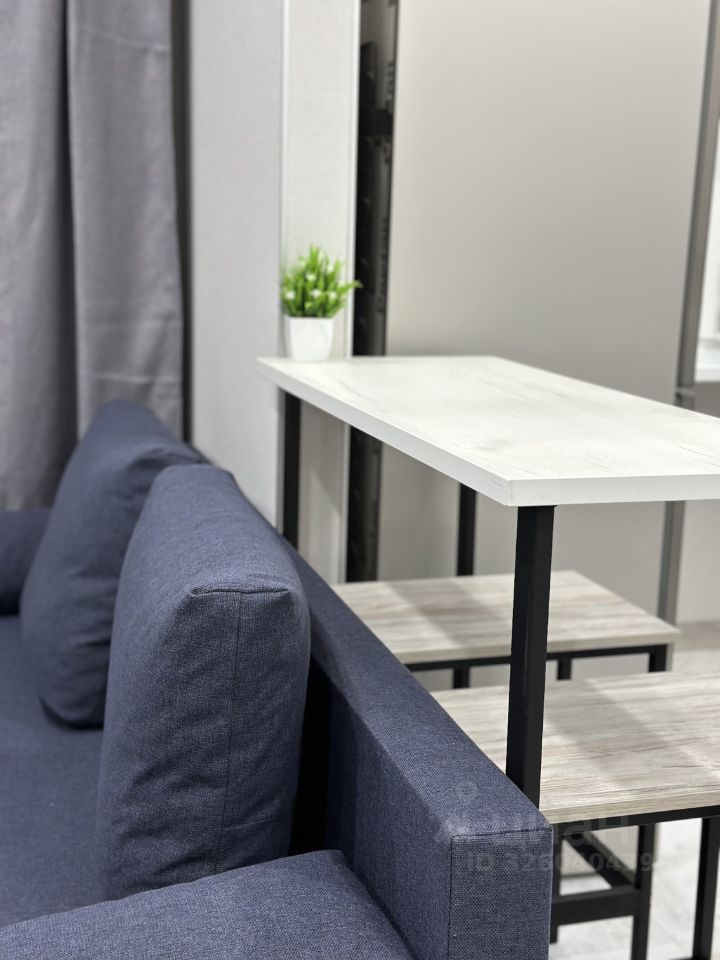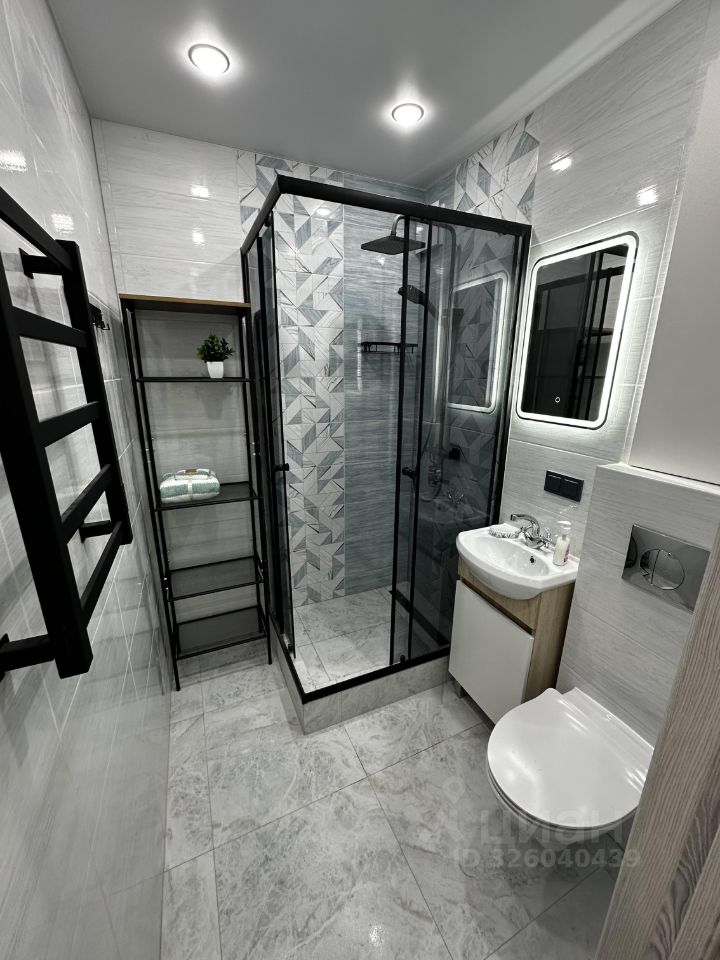 В квартире выполнен дизайнерский ремонт, что создает современную и стильную атмосферу. В кухне и комнате есть вся необходимая мебель для комфортного проживания. На кухне установлен холодильник, в комнате — телевизор. В ванной комнате есть душевая кабина и стиральная машина, что делает повседневный быт удобным.
