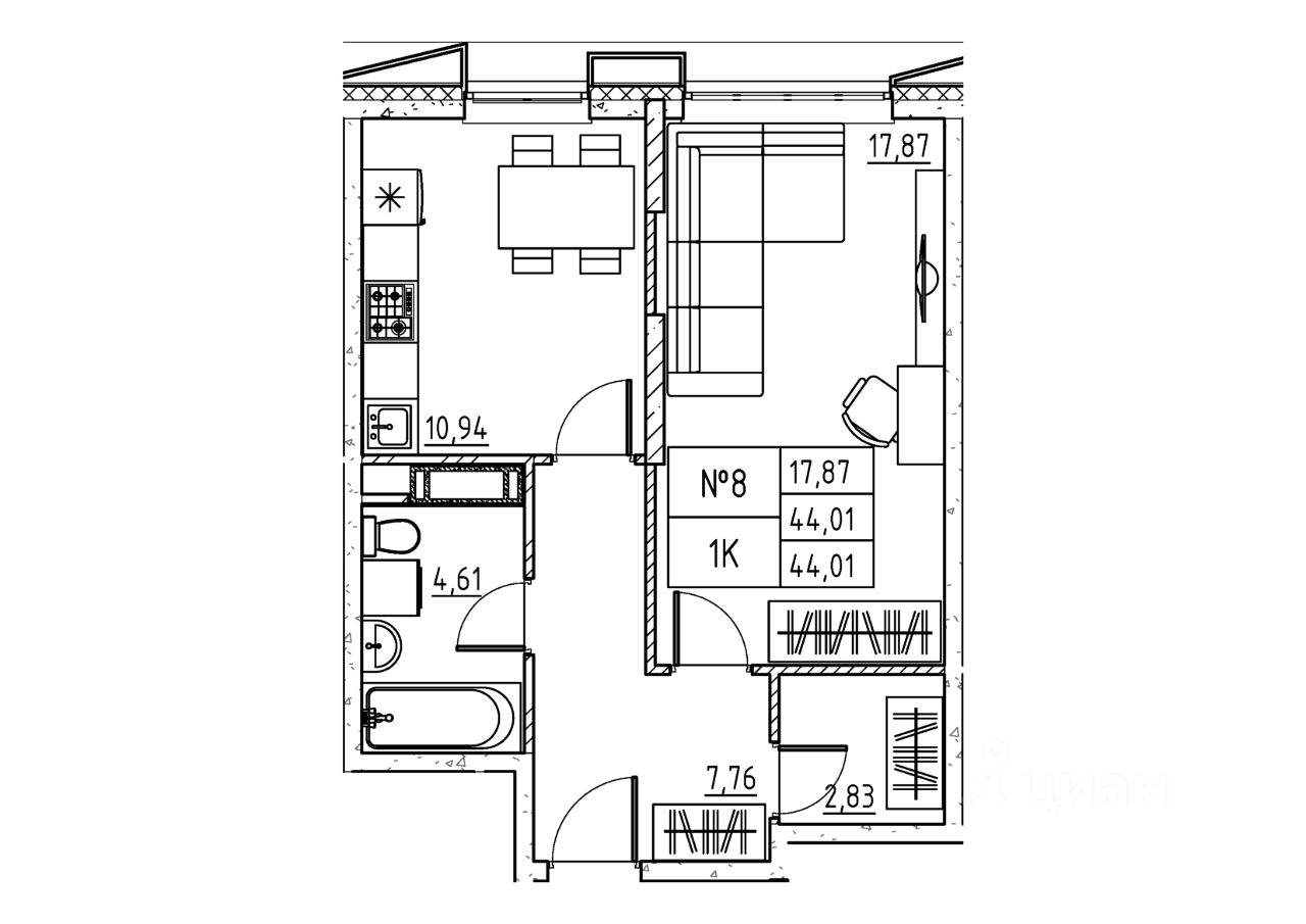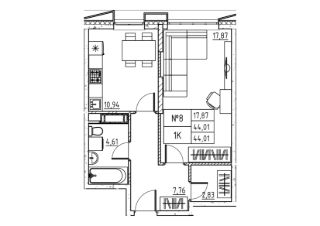 1-комн. квартира, 44,01 м²