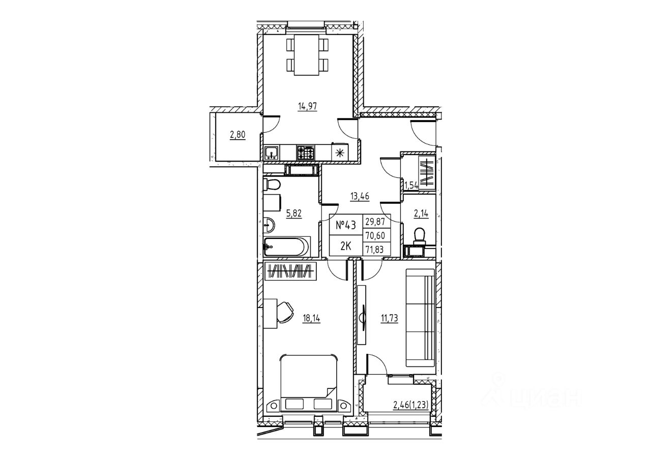 2-комн. квартира, 73,06 м²