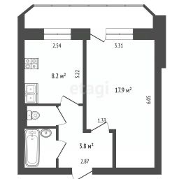 Планировка отличается продуманной функциональностью: просторная жилая комната гармонично сочетает зону отдыха и пространство у окна, которое можно организовать под рабочее место.