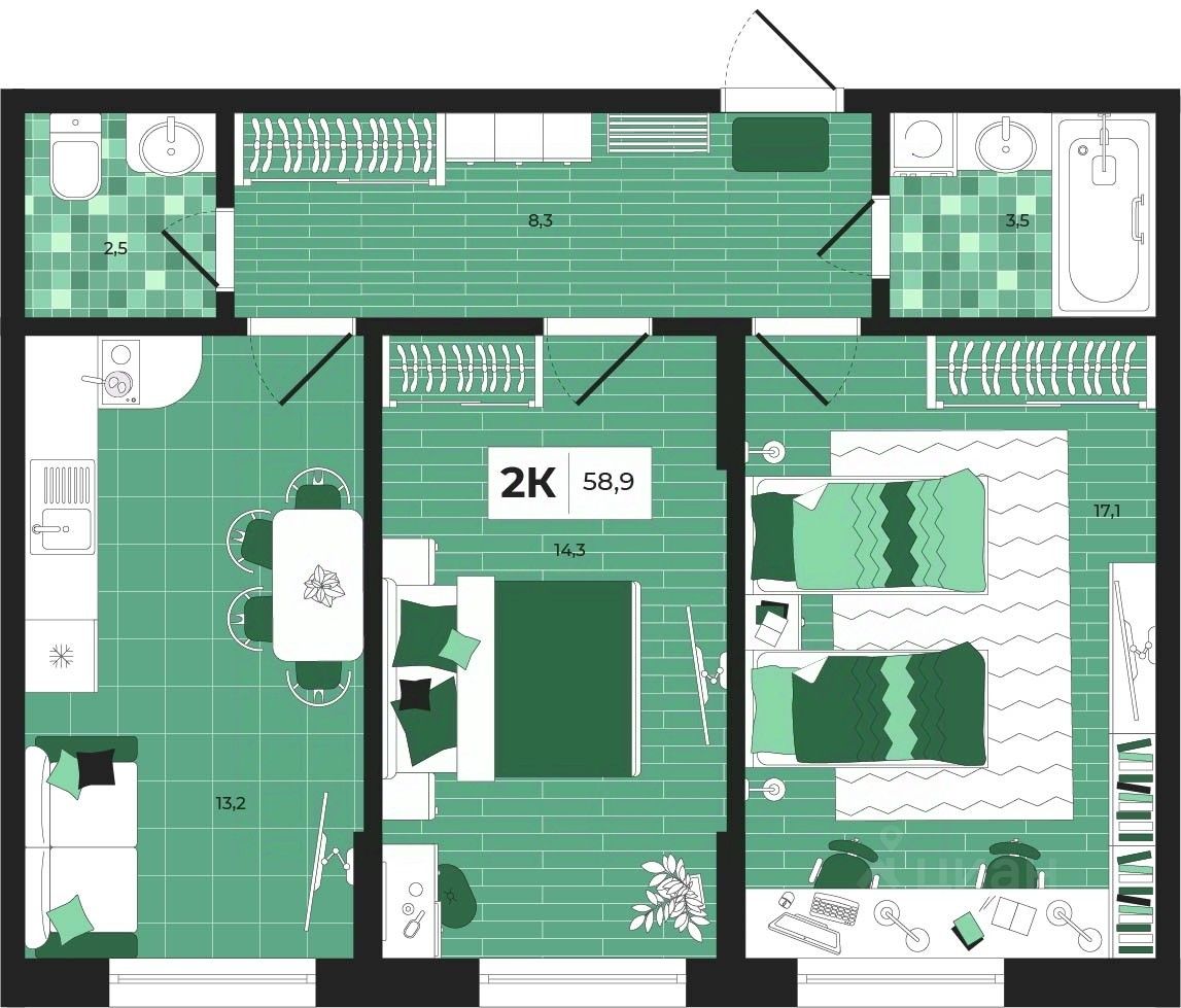 Продаётся 2-комнатная квартира в строящемся доме (Дом 2. Гармония), срок сдачи: II-кв. 2028, общей площадью 58.9 кв.м., на 10 этаже. Новый жилой комплекс "Доверие" от застройщика "Ин-Групп" расположен по адресу: Московская область, г. Дубна, ул. Тверская
