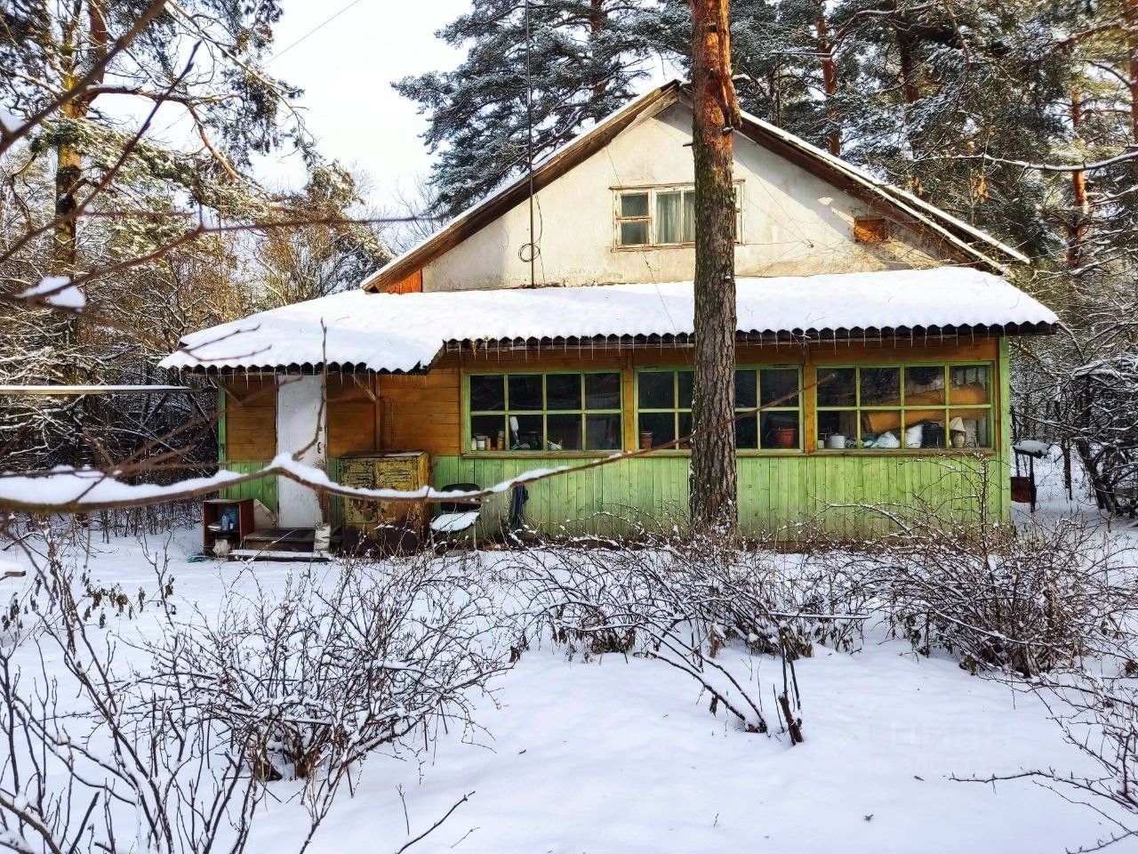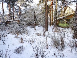 Участок с соснами и плодовыми деревьями.